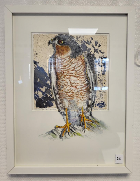 16. Hanne Galschiøt, syet Guache, "Duehøg", 42x32