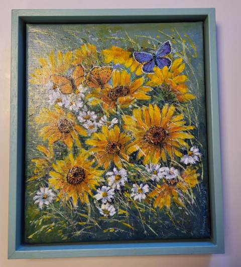 15. Hanne Galschiøt, akryl på lærred, "Solsikker", 30x25